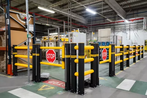 Pentru un plus de siguranță, soluția a fost completată cu porți de siguranță SGA, dotate cu indicatoare „Stop” și semnalizare luminoasă, integrate în liniile de bariere Traffic R3. Acestea controlează circulația pietonilor în zonele critice și reduc riscul accesului accidental pe traseele utilizate de vehicule.